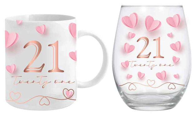 - Features Rose Gold decal with pink hearts, on both Mug and Glass reads “21 Twenty One”.