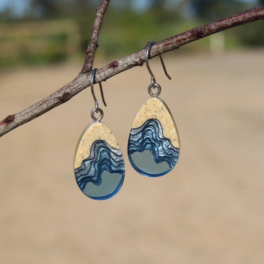 These Seashore Dangle Earrings have been carefully handmade from bonded beach sand, ultramarine blue resin and metal pigments with a high-gloss polished finish. Eye pins connect each earring to an allergy friendly stainless steel french hook.