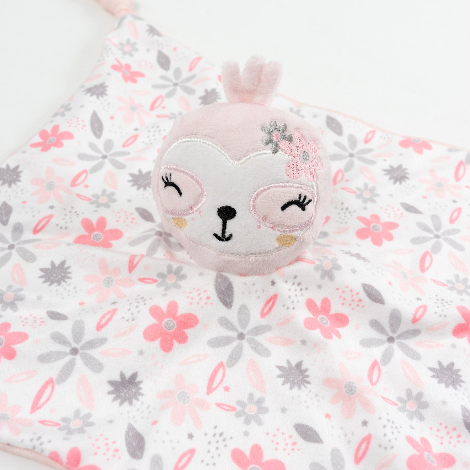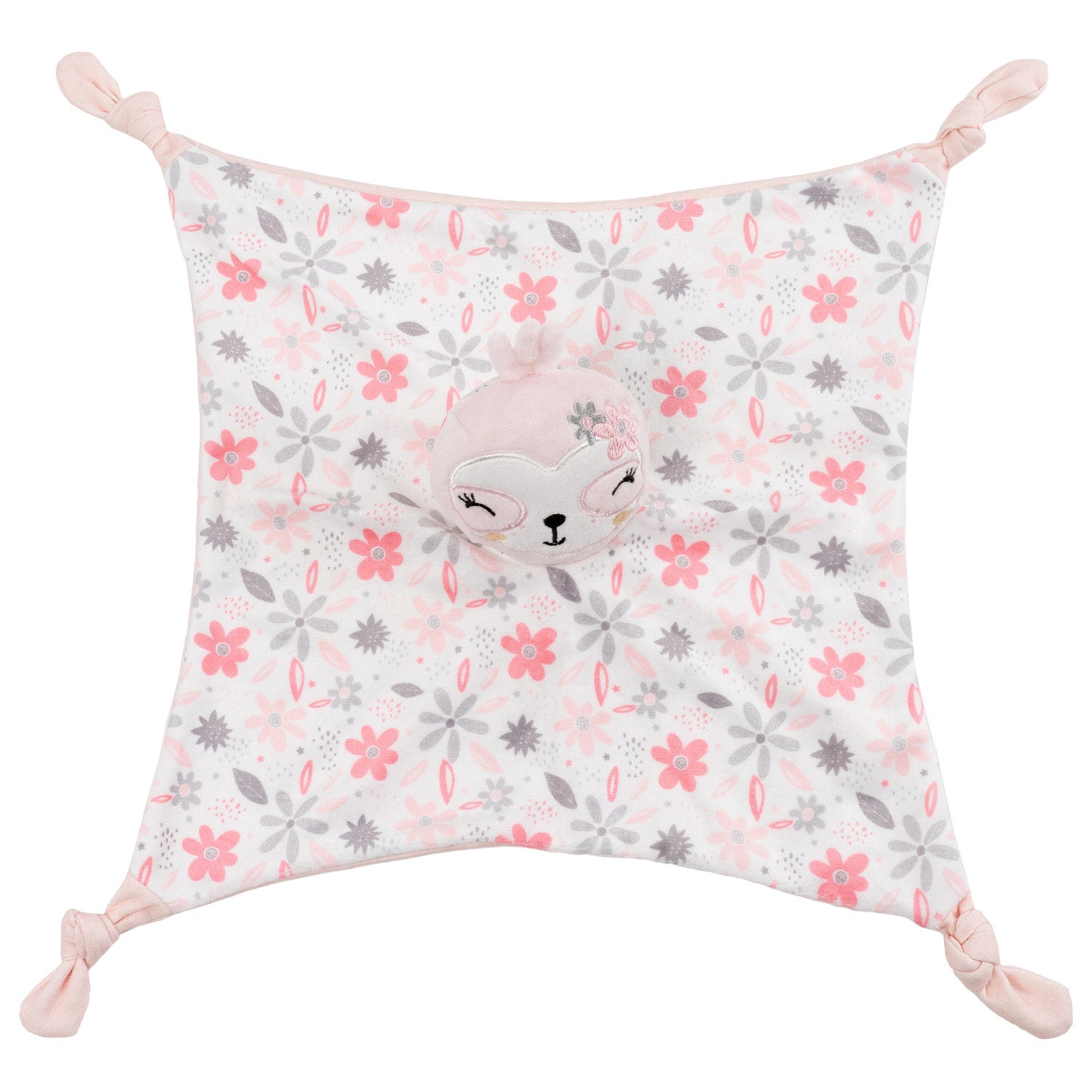 - Plush baby comforter. Soft blanket with knotted corners for sore gums and attaching dummy! Made from a durable soft cotton/polyester blend.
